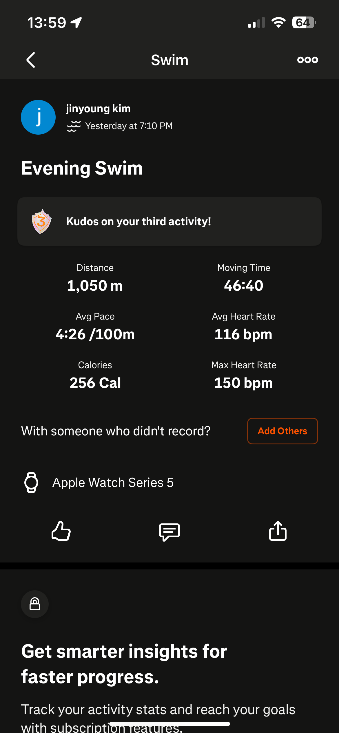 - 평균보다 심박수 관리가 잘 되었고, 페이스 유지도 만족스러웠던 루틴이었습니다. 월수금 외 루틴을 수영으로 채우며 전체 밸런스를 맞춰가고 있습니다.
